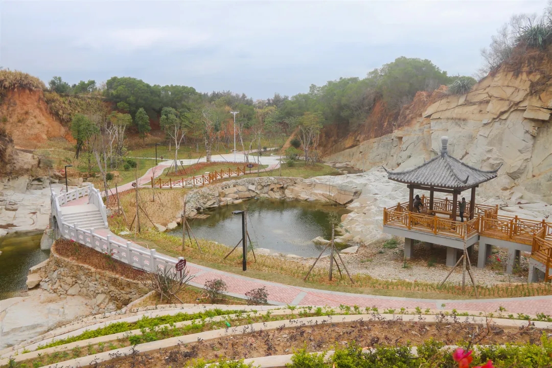 穿过中心广场、小石桥、水中亭、观景台