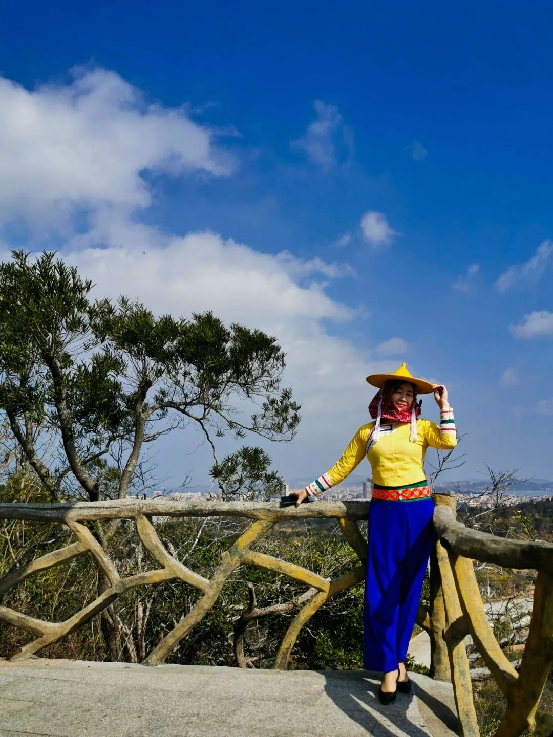 头披花头巾、戴黄斗笠