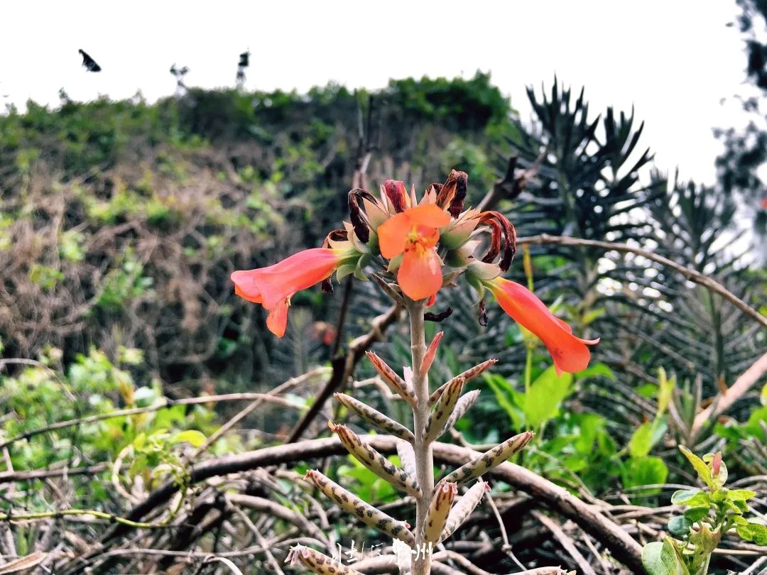 更多的房子成了危楼,无人打理,被拉上警示标识。榕树盘根错节,穿墙而出。家宅日渐倾颓,石埕杂草丰盛。废弃的厝顶、板石上,落满棒叶不死鸟。它们像红色的灯笼一样盛开,俨然荒芜宅地的新主人。