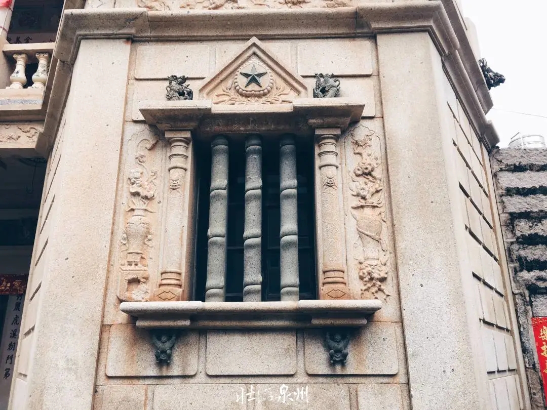与村里方方正正的南洋楼不同,秀芬楼的几何外型更为别致精巧。钝角和圆角外凸,构造成外廊。洋楼共两层,一层为白石板,砌筑工整。二层红砖墙,纹饰多变。立面灰塑镶圆钟,两旁双狮夺球,窗台则欧式古典。