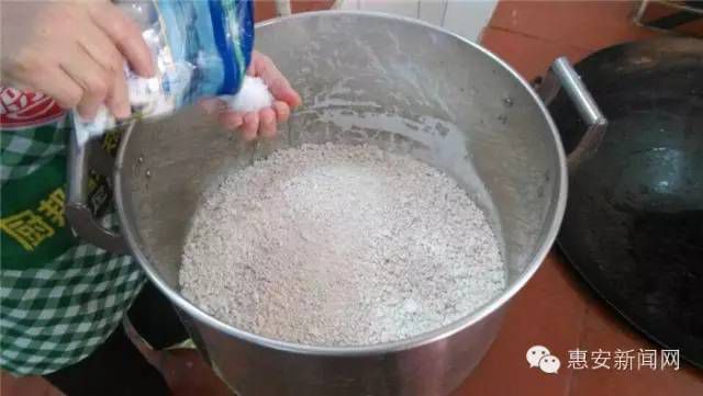 薯粉调味、加水勾芡、干炒花生米、入锅力乾,木制的薯橹在壮实的大嫂手中沿顺时针不停地乾(用力搅拌),薯粉糊由稀变稠,由白色变为有点透明的灰褐色。在其半熟状态,倒入干炒花生米,再继续乾,直至花生米均匀地与薯粉粘在一起。薯粉熟透了,起锅装碗。再烧制由高丽菜、小肠、海蛎做出的汤汁,淋在碗中薯粉团上。