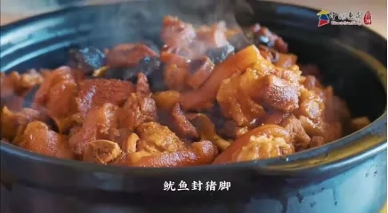除了海味,山珍同样是惠安人的拿手好菜。猪蹄焯水 加大料爆炒,再换砂锅小火慢煨,鱿鱼封猪脚,大快朵颐。