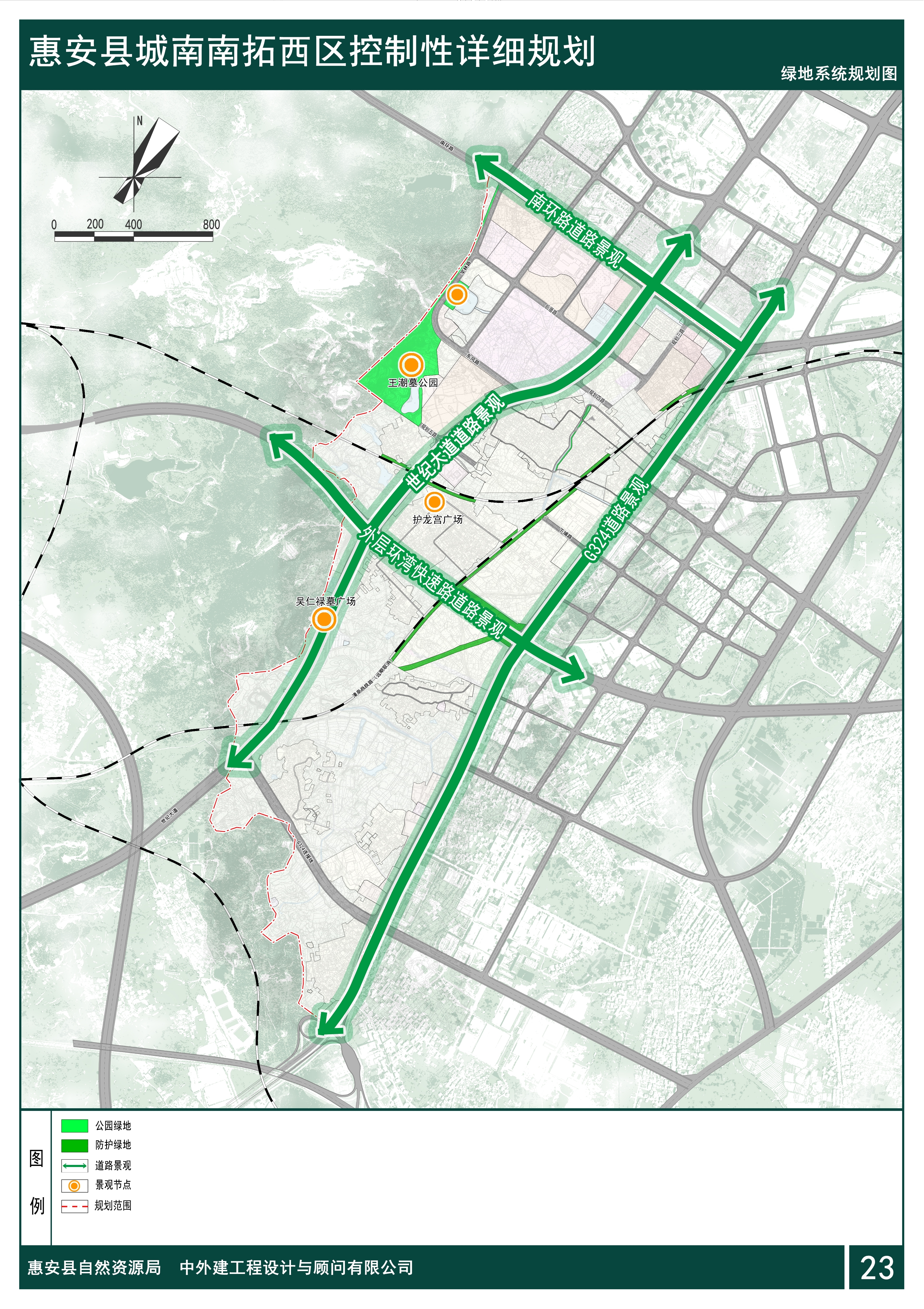 规划形成“四轴、多点”的绿化景观系统。四轴:国道324、世纪大道、南环路、外层环湾快速路等道路绿化景观轴,设置景观标志物,具有观赏性与引导性;多点:主要以王潮墓、吴仁禄墓、护龙宫等文物古迹形成的景观节点以及城市道路交汇处形成的景观节点,通过广场的设置与公共空间的梳理、组织,提高公共生活的趣味性,展示惠安城南门户的景观风貌。