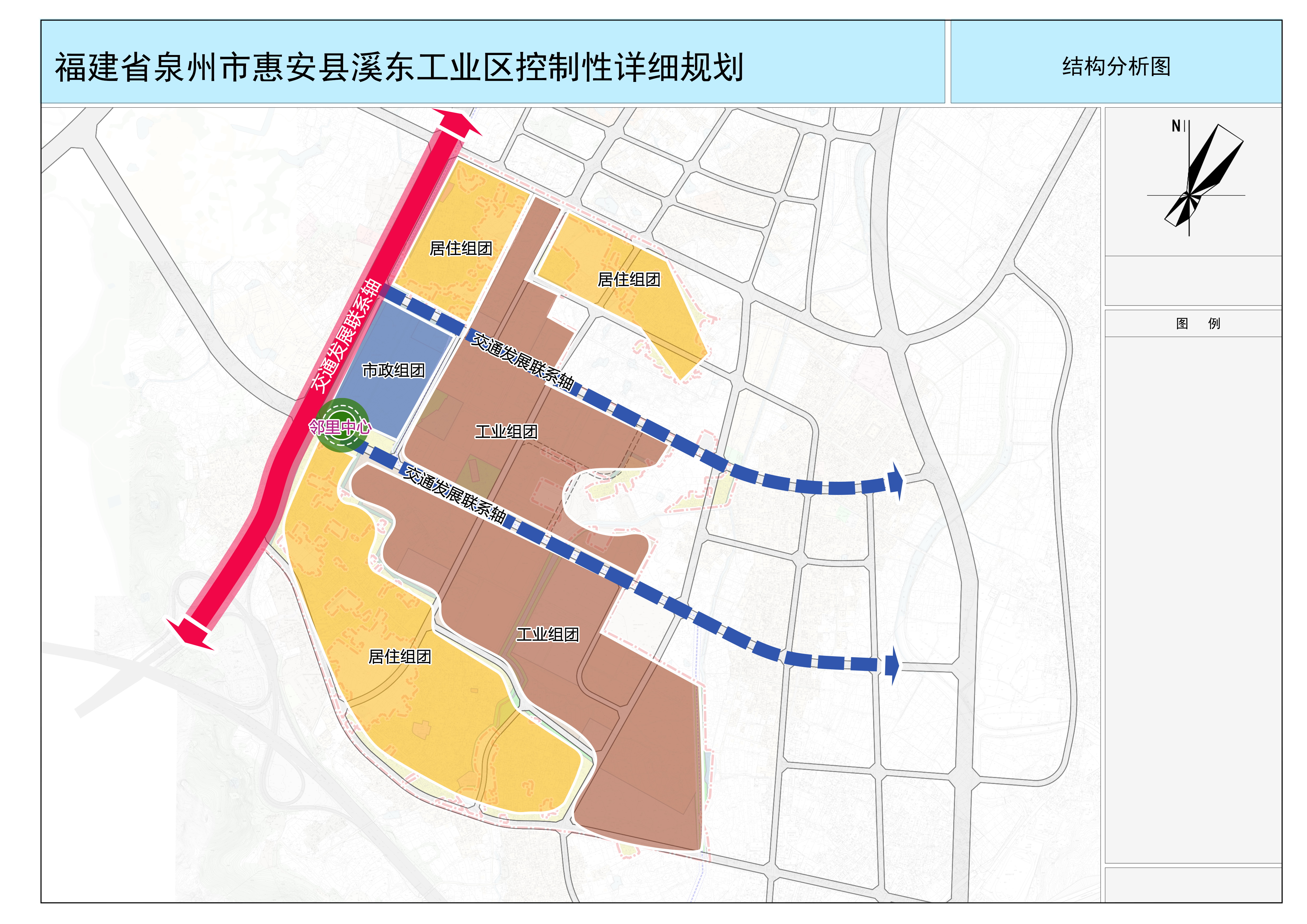 依托惠华路形成南北向的交通发展联系轴,强化园区与高速及惠安中心城区的联系。依托横一路及横二路形成东西向的发展轴,推动园区成片发展。