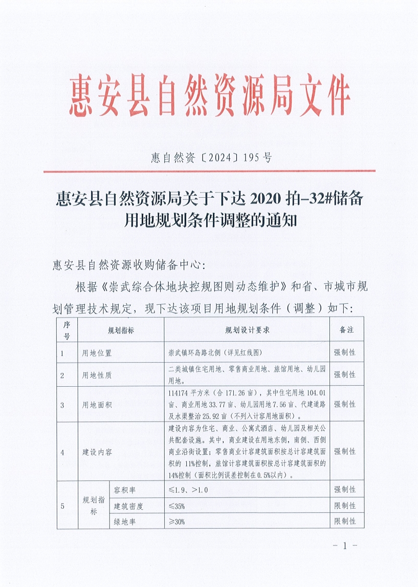 《崇武综合体地块控规动态维护》已经惠政文〔2024〕61号文批复,现对该控规动态维护及控规范围内2020拍-32#储备用地规划条件调整予以公示,公示内容如下: