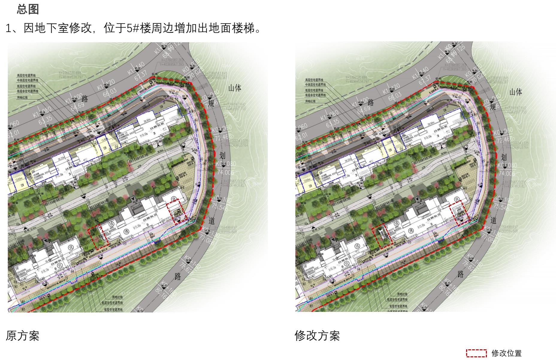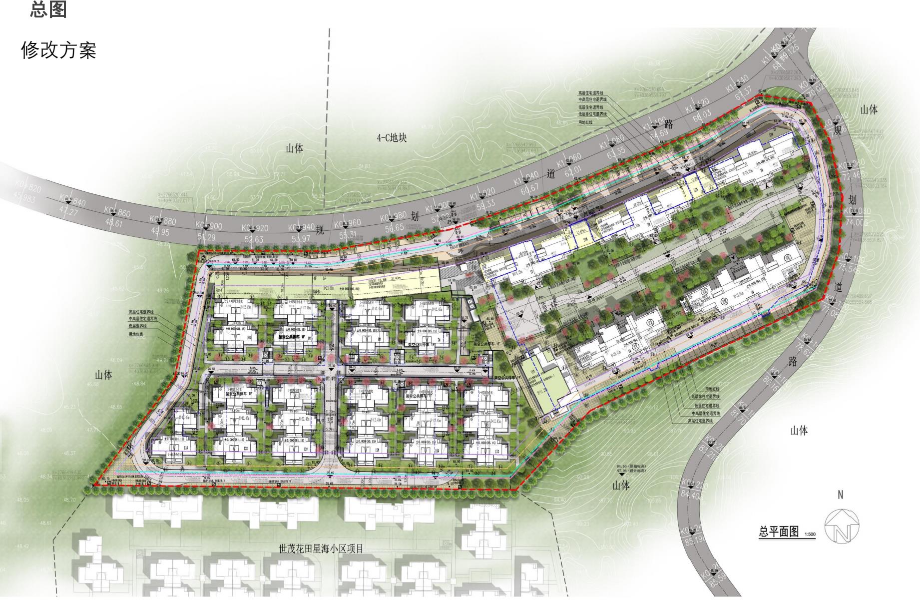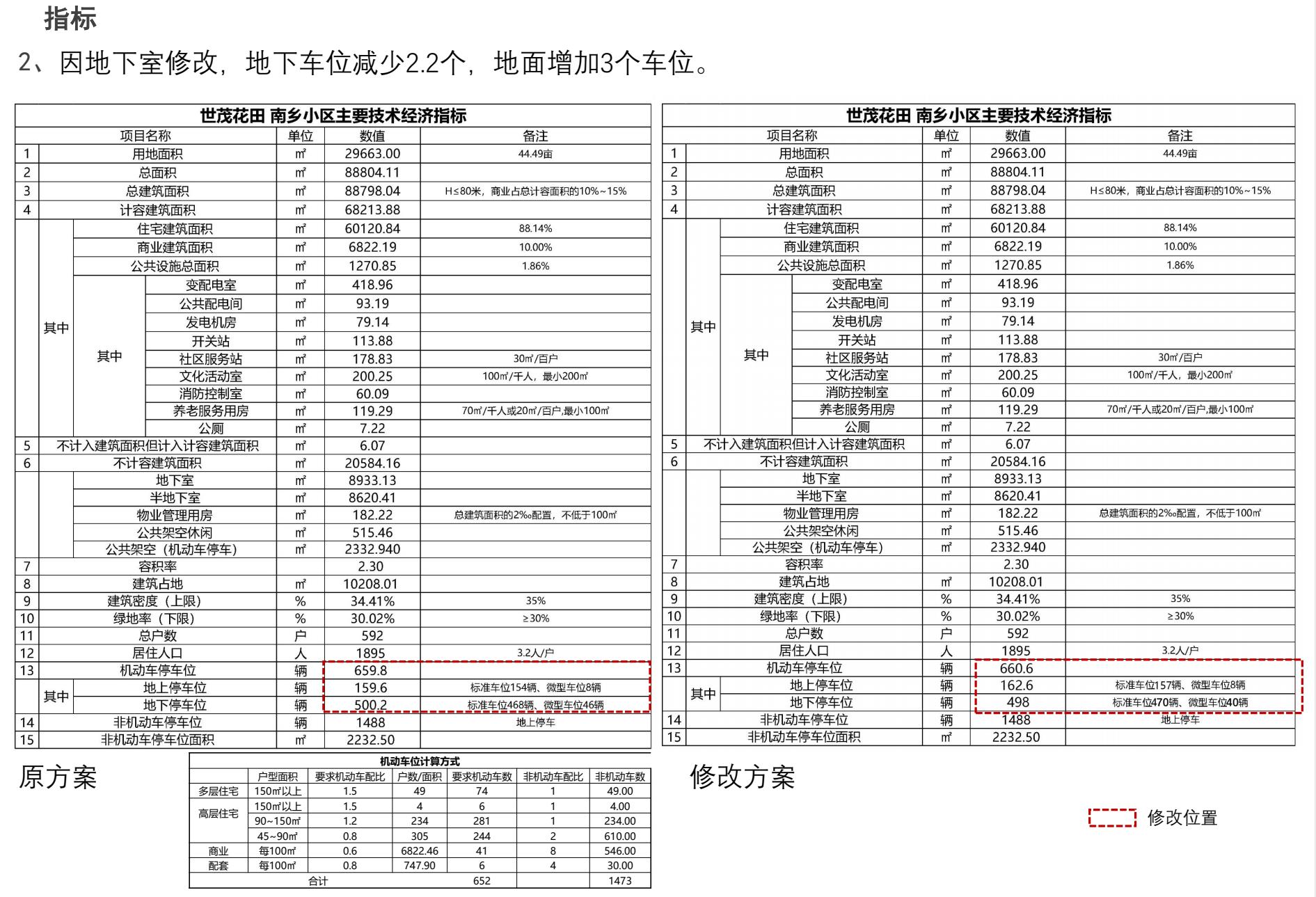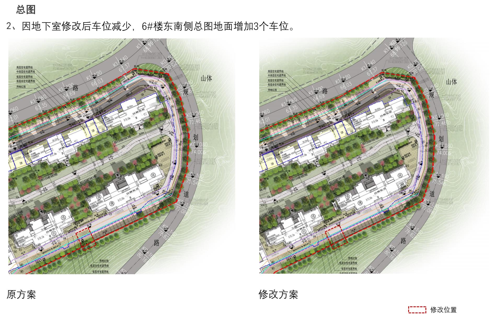 公示图件:世茂花田南乡小区规划总图、地下室平面图、指标表及1#、2#、3#楼单体图调整前后方案