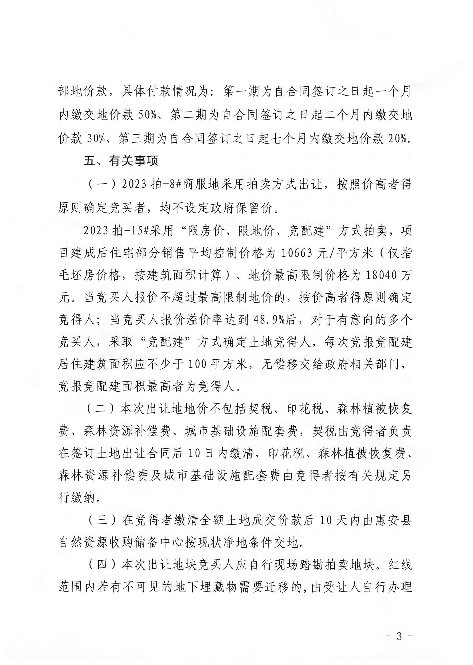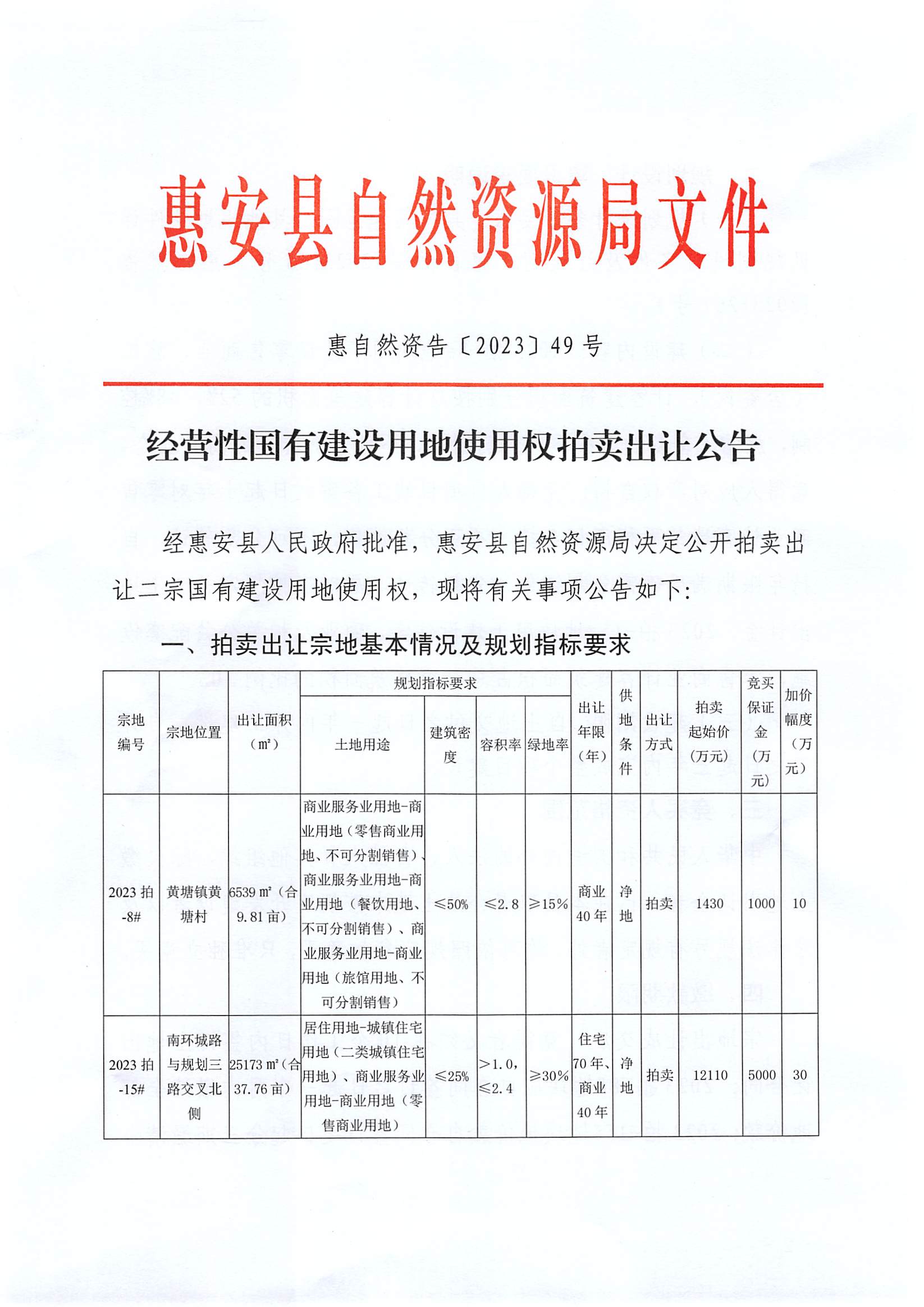 经营性国有建设用地使用权拍卖出让公告(惠自然资告〔2023〕49号)