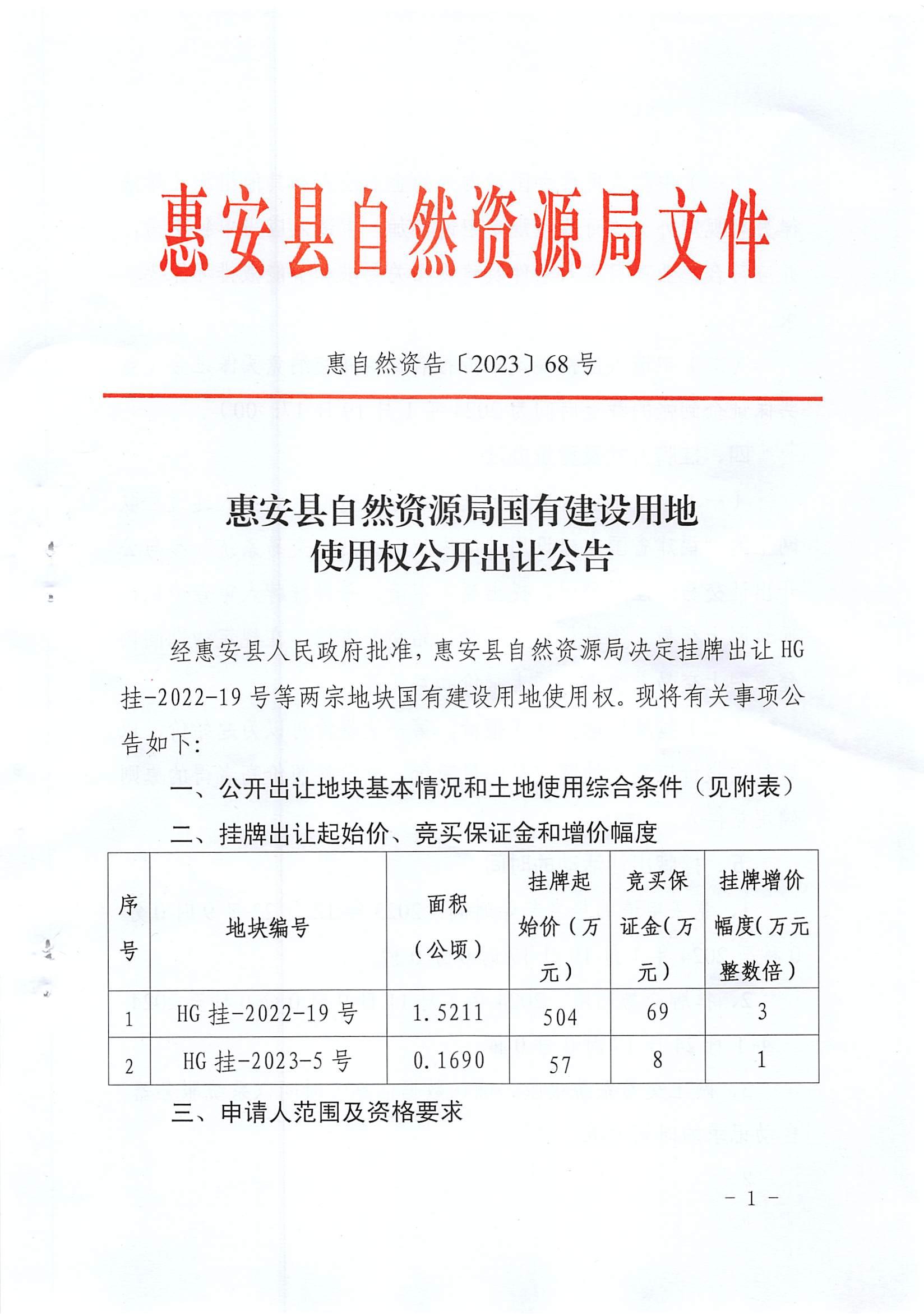 bsport体育 自然资源局国有建设用地使用权公开出让公告(惠自然资告[2023]68号)