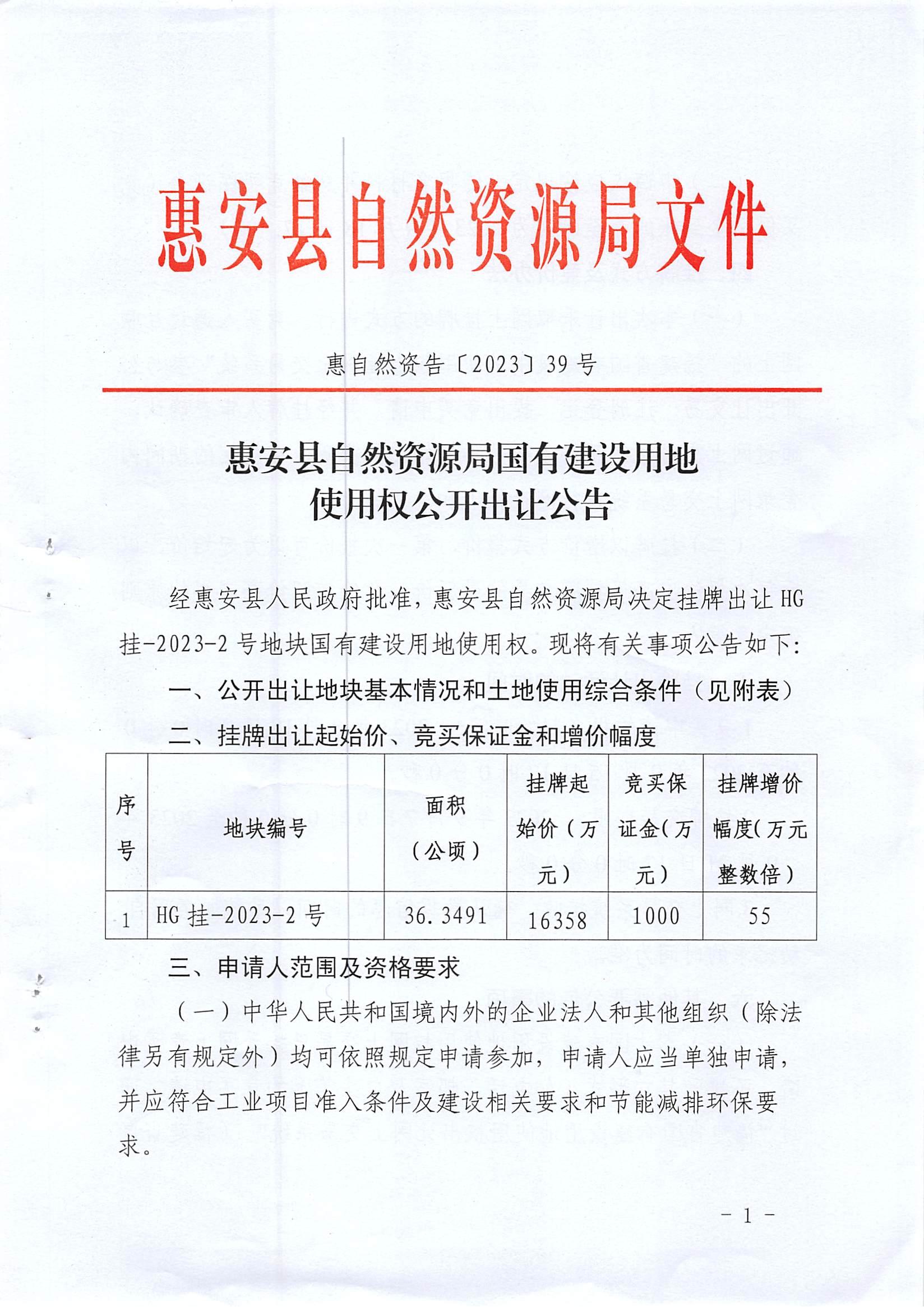 bsport体育 自然资源局国有建设用地使用权公开出让公告(惠自然资告[2023]39号)