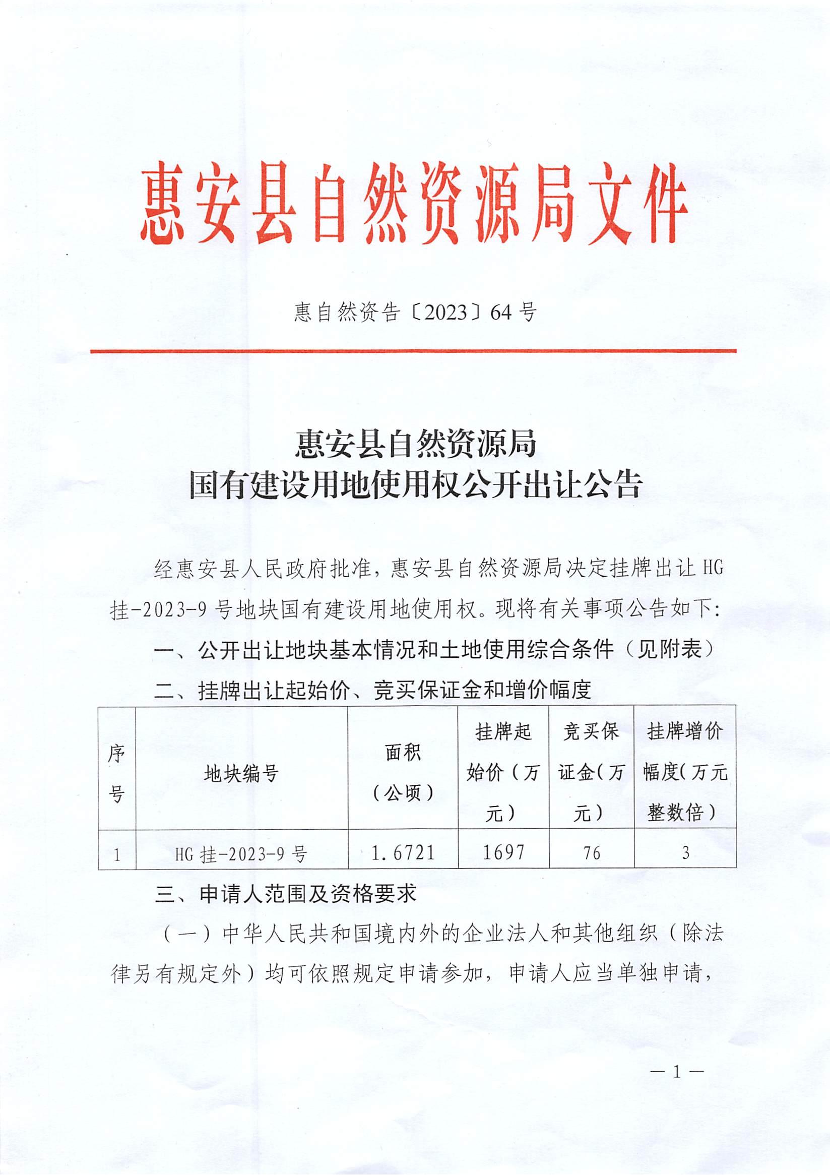 bsport体育 自然资源局国有建设用地使用权公开出让公告(惠自然资告[2023]64号)