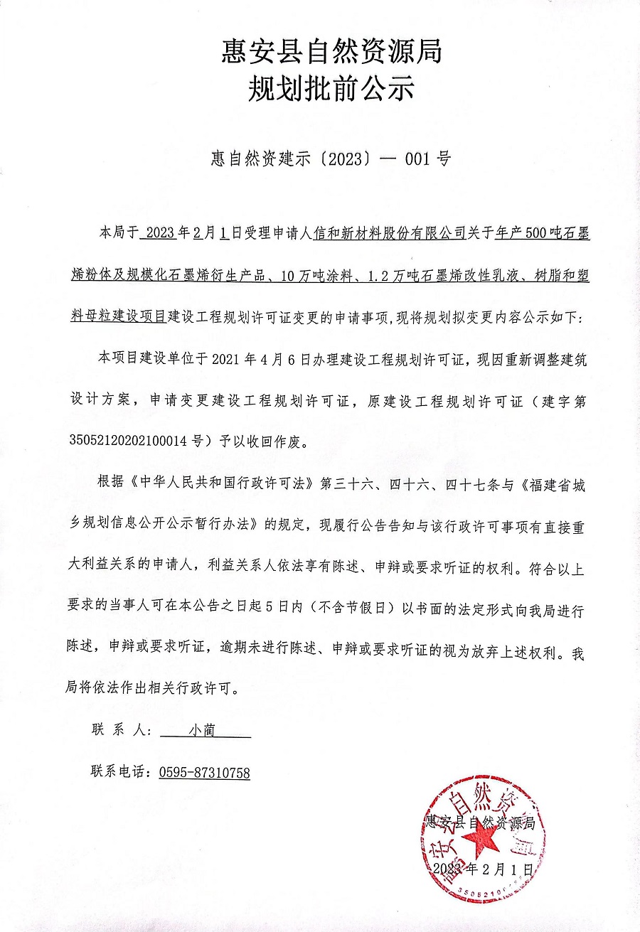 年产500吨石墨烯粉体及规模化石墨烯衍生产品、10万吨涂料、1.2万吨石墨烯改性乳液、树脂和塑料母粒建设项目建设工程规划许可证变更前公示