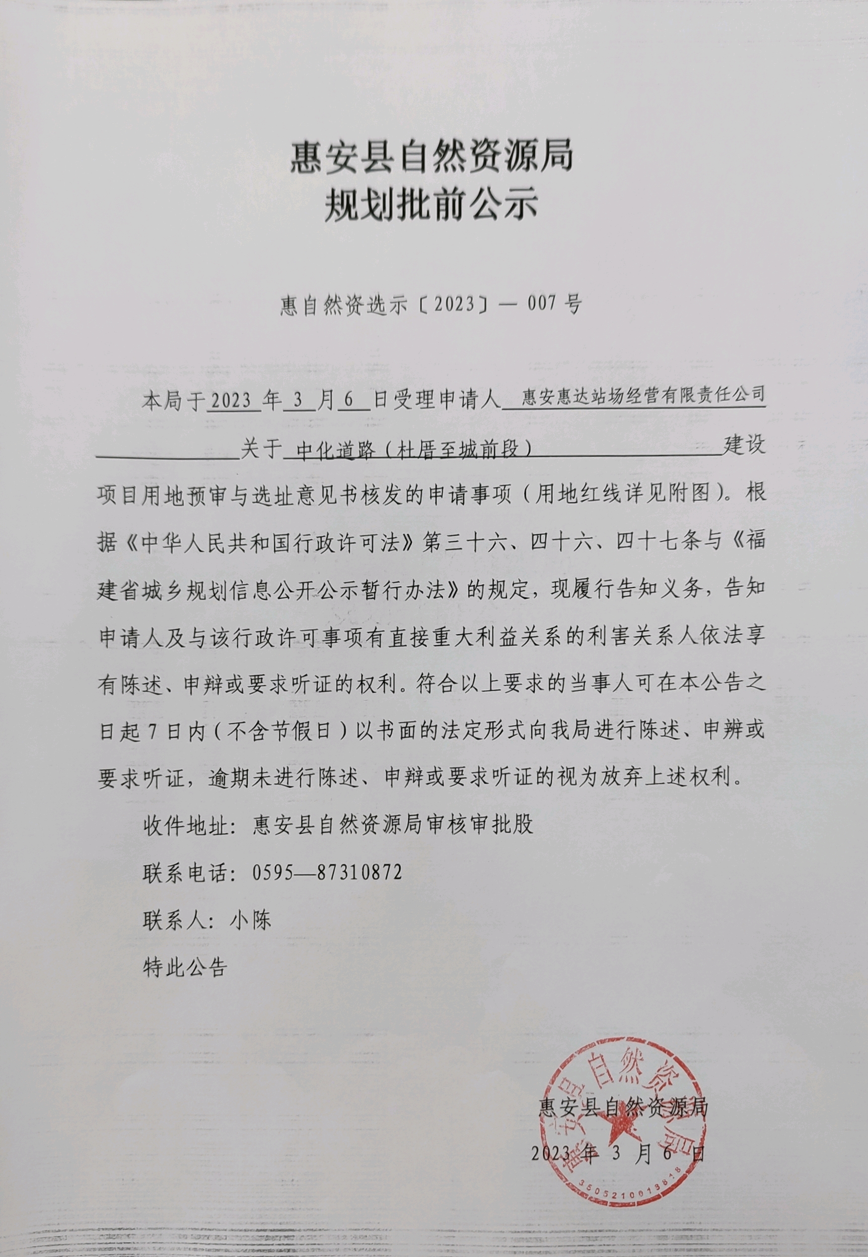 中化道路(杜厝至城前段)建设项目用地预审与选址意见书规划批前公示