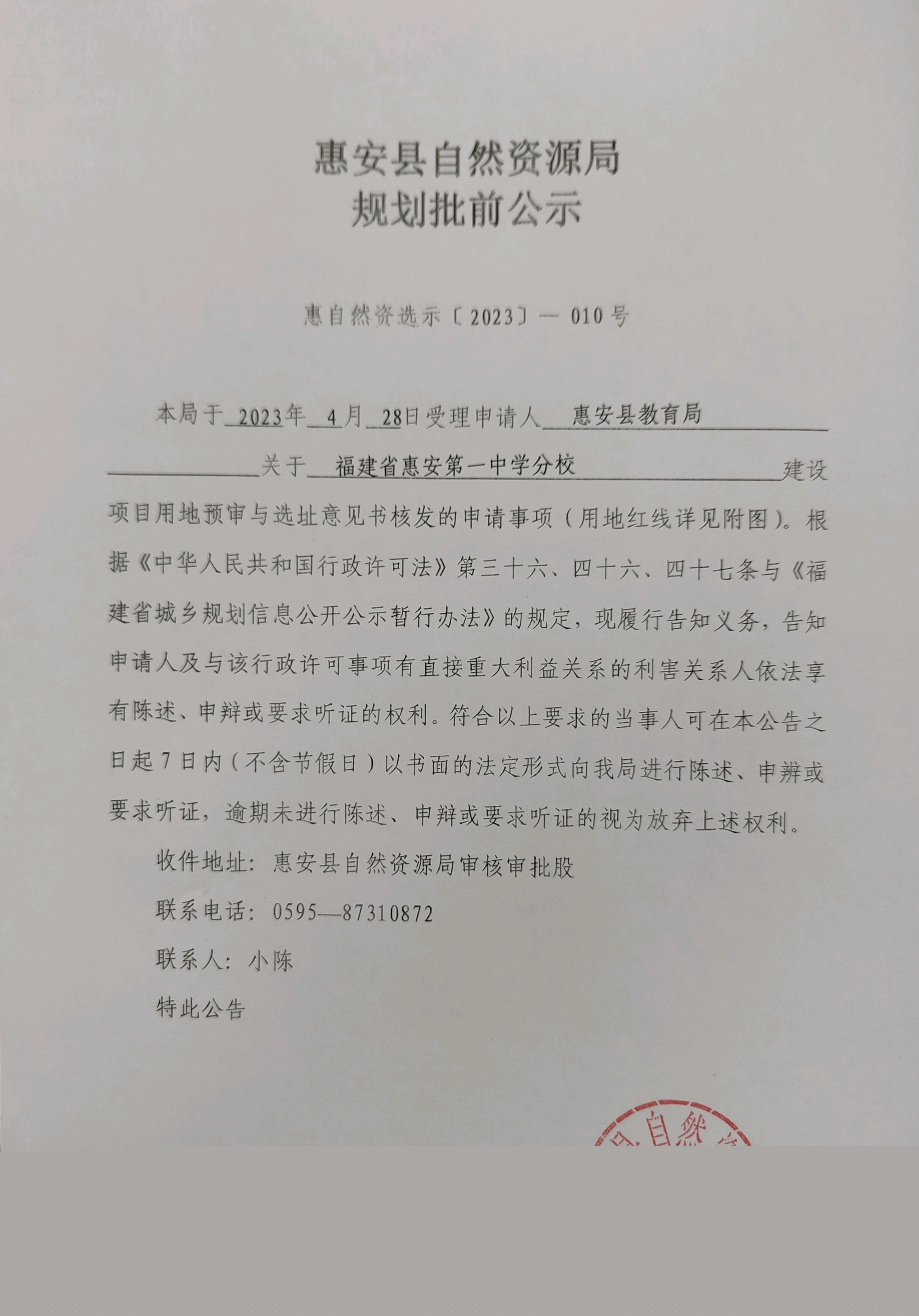 福建省惠安第一中学分校建设项目用地预审与选址意见书规划批前公示