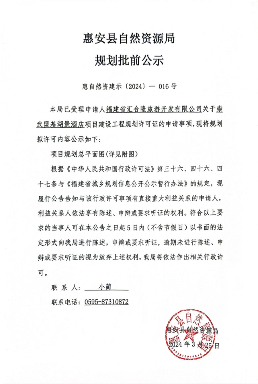 崇武盟基湖景酒店项目建设工程规划许可证批前公示