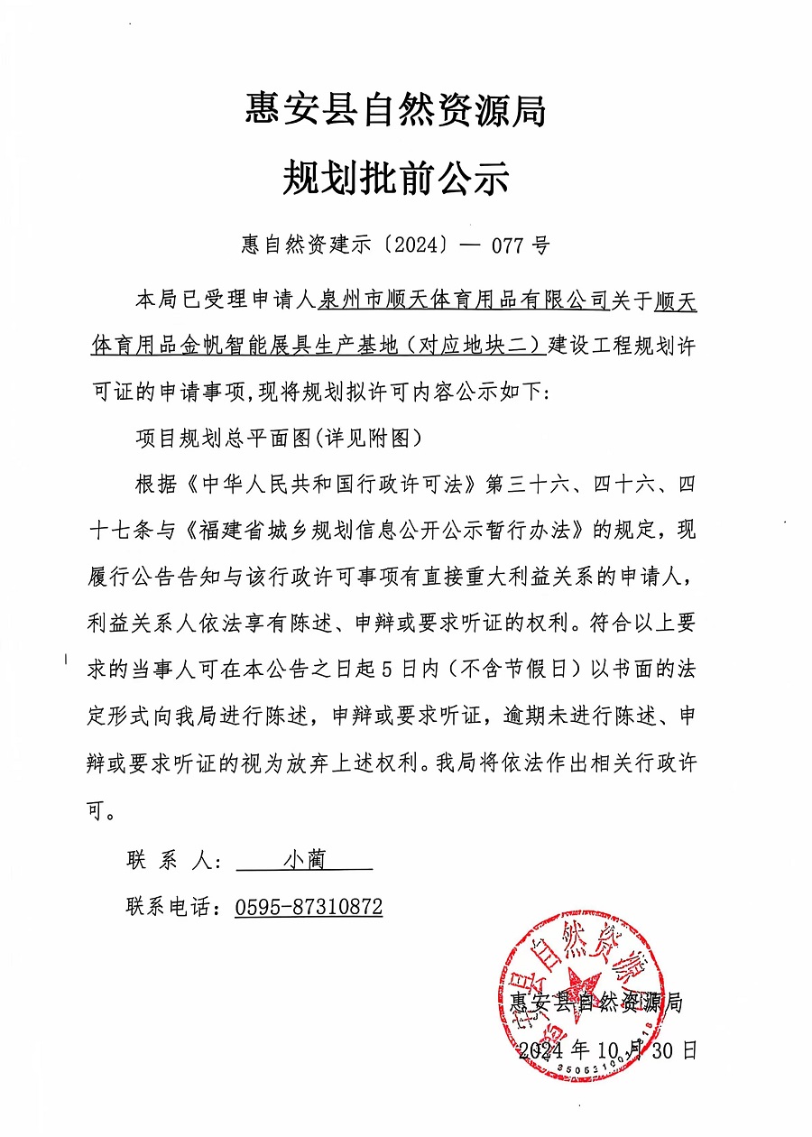 顺天体育用品金帆智能展具生产基地(对应地块二)建设工程规划许可证批前公示