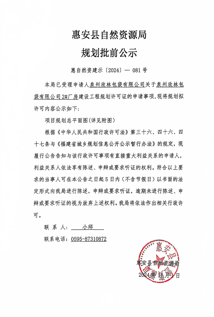 泉州欣林包袋有限公司2#厂房建设工程规划许可证批前公示