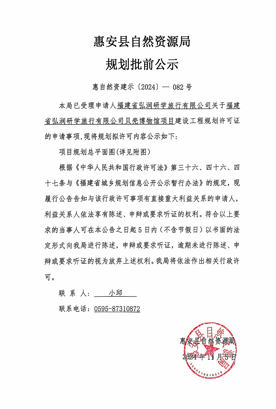 福建省弘润研学旅行有限公司贝壳博物馆项目建设工程规划许可证批前公示