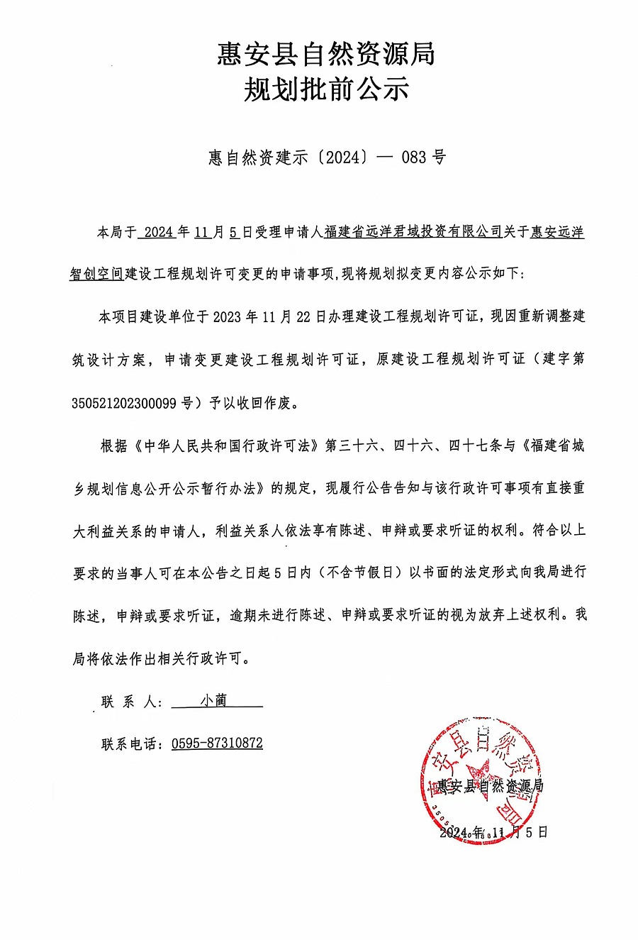 惠安远洋智创空间建设工程规划许可证变更批前公示