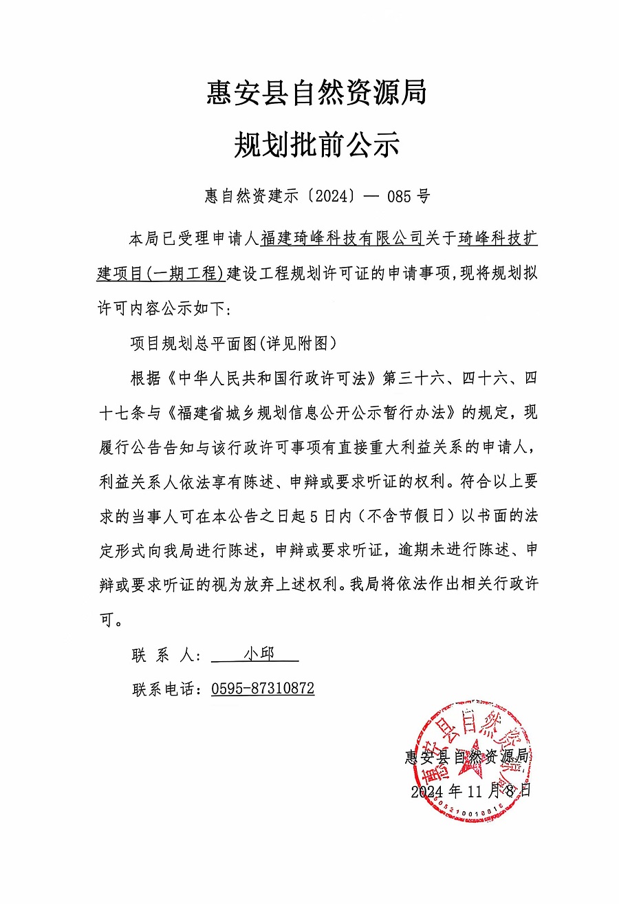 琦峰科技扩建项目(一期工程)建设工程规划许可证批前公示