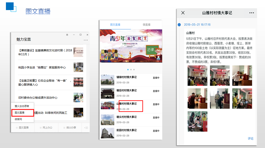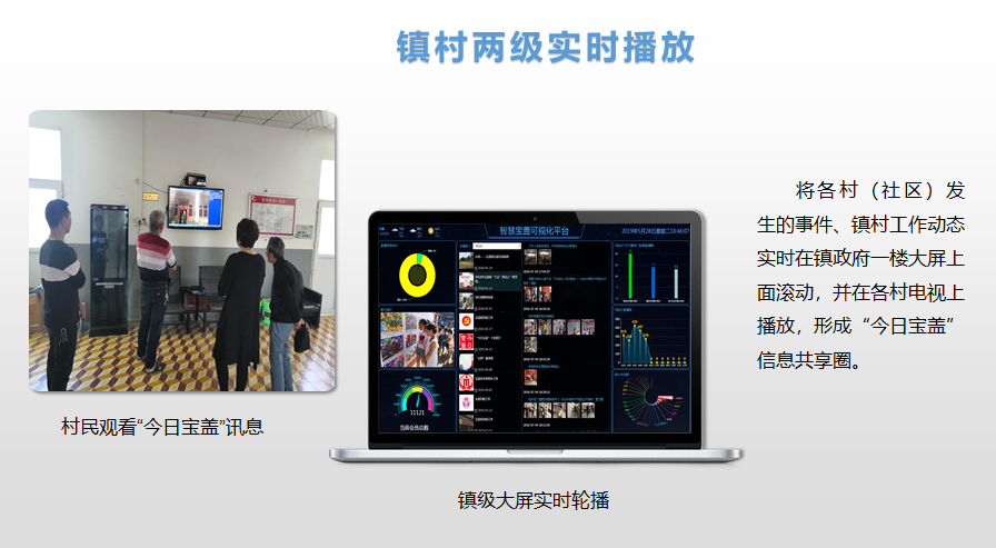 宝盖镇以“魅力宝盖”公微号为基础,率先建成集图文直播、网上办证、安全生产监管、绩效系统、综治入户、党建系统、乡风文明、线上直播等为一体的综合信息化管理服务平台——“智慧宝盖”,促进线上线下互动融合,有力推动基层政务公开与村(社区)公开协同发展,让政务服务更加阳光透明。设置 “村情大事记图文直播”版块,实时共享信息,进一步增强与群众互动性,提高宣传及时性,目前图文直播会员已达26.5万人;开设“宝盖直播间”,通过群众喜闻乐见的宣传方式,有针对性地宣传移风易俗、“乡风文明”积分制等政策措施,及时收集和回应相关舆情,做好新形势下群众工作。同时,该镇积极探索搭建可视化便民服务平台,通过与工作人员可视化通话来反馈需求与诉求,有效解决村内老年人不熟悉智能手机操作的困境,目前可视化平台已在抓紧建设中。